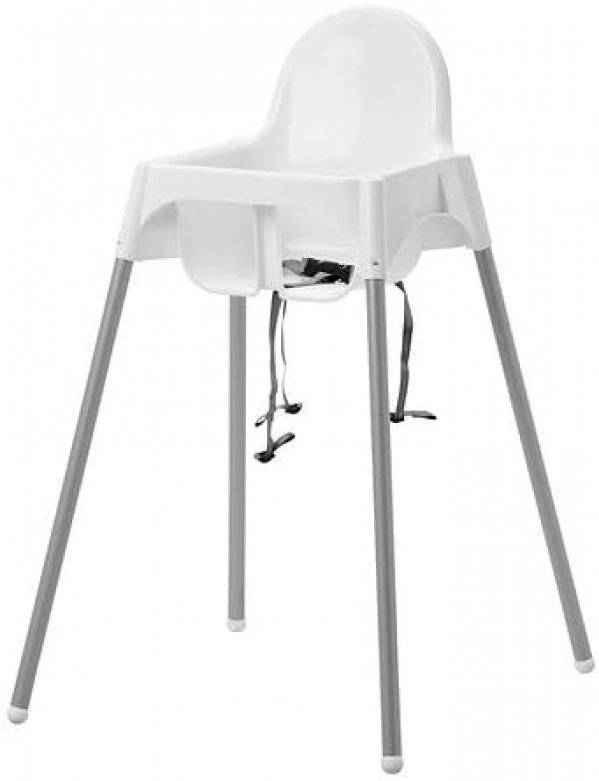 Your child will dine in style with Ikea's white/silver ANTILOP Highchair with safety belt. It is easy to disassemble and transport. Safety belt included. Wipe clean with a mild soapy solution.